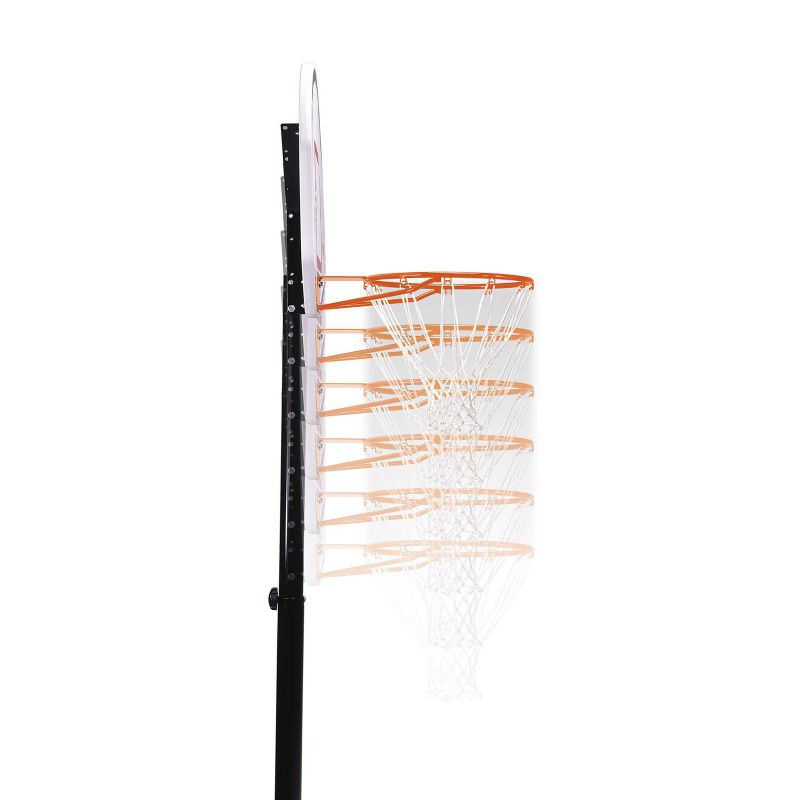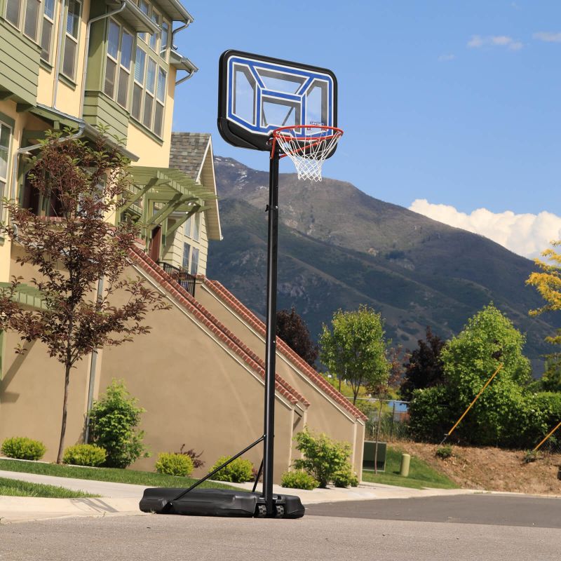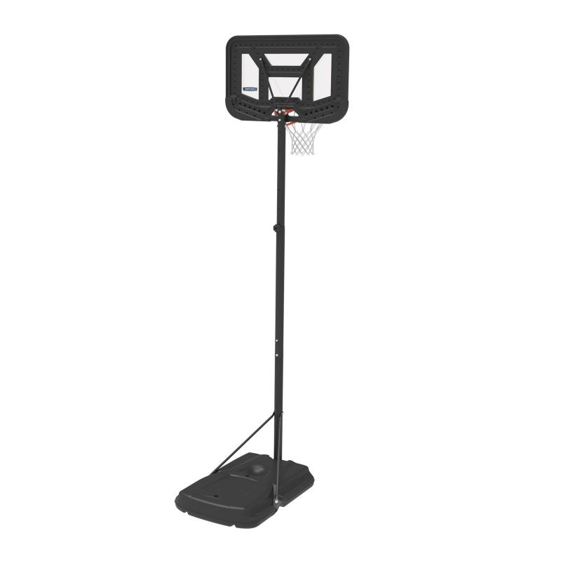The portable basketball stand has a 44 "backboard made in Steel-Framed Shatter-Proof technology. Shatter-Proof technology guarantees many years of durability and impact resistance thanks to the coating of the highest quality Makrolon® polycarbonate. Steel-Framed is a durable steel frame of the backboard. Telescopic height adjustment. The board allows for quick and easy setting at various heights, ranging from 228 to 304 cm, ensuring comfortable and safe play at any level of advancement. The whole is complemented by a durable hoop with weather-resistant nylon mesh and a round pole with a diameter of 6.9 cm. HDPE with a capacity of 45 liters, filled with water or sand, ensures full stability of the stand. An ideal set for beginners and intermediate basketball players.