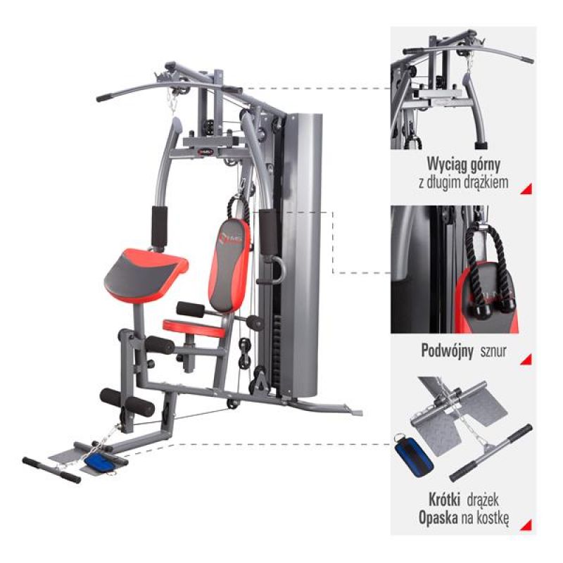 TYTAN 7 HMS is a professional device for exercising at home. The equipment was made of solid steel profiles, having an additional cover, which guarantee high stability and safety of use. All handles have a rubber finish offering a secure grip and a non-slip surface.